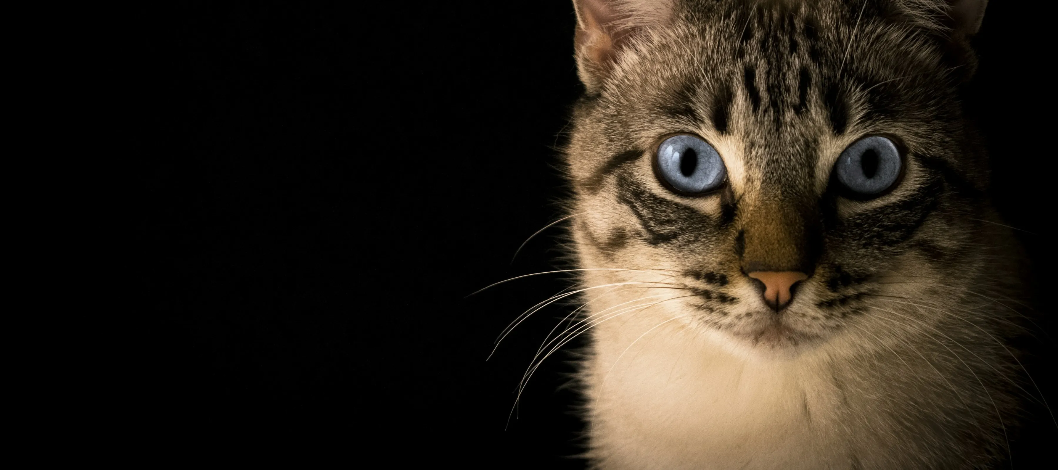 Close-up of a cat with striking blue eyes and striped fur against a black background